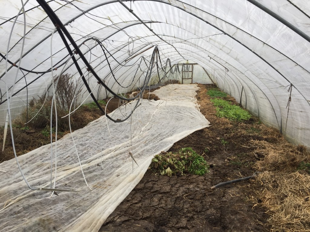 I år vill vi börja leverera mycket tidigt. Problemet med att börja att odla tidigt är att marken oftast fortfarande är mycket blöt, vilket gör det omöjligt att köra traktor (om man kör på jätteblött mark blir marken mycket tät där man har kört, det gör det mycket svårt för rötterna att växa). Så i år har vi äntligen gjort det vi har pratat om i så många år: täcka marken med en jättestor plastbit. Detta dödar allt ogräs (eftersom dom inte får något ljus) och håller marken lite torrare . Dessutom mår marken mycket bättre av detta än av att blir mekaniskt bearbetat med maskiner. Det stora, stora problemet är att det inte är så lätt att hålla marken på jorden. Den vill alltid flyga iväg. Tänk er ett 600 m2 segel! För detta har vi lagt jordfyllda säckar på den i tre omgångar. Varje gång tänkte vi: nu kommer plasten aldrig att röra sig. Men även nu, medan jag sitter här och skriver, ser jag hur vinden lyfter plasten på några ställen. Fastän det ligger nästa 2 ton sand på den och allt detta måste vi flytta sen när det är dags att plantera. Bredvid plasten på bilden ser ni vitlöken vi satt i september.