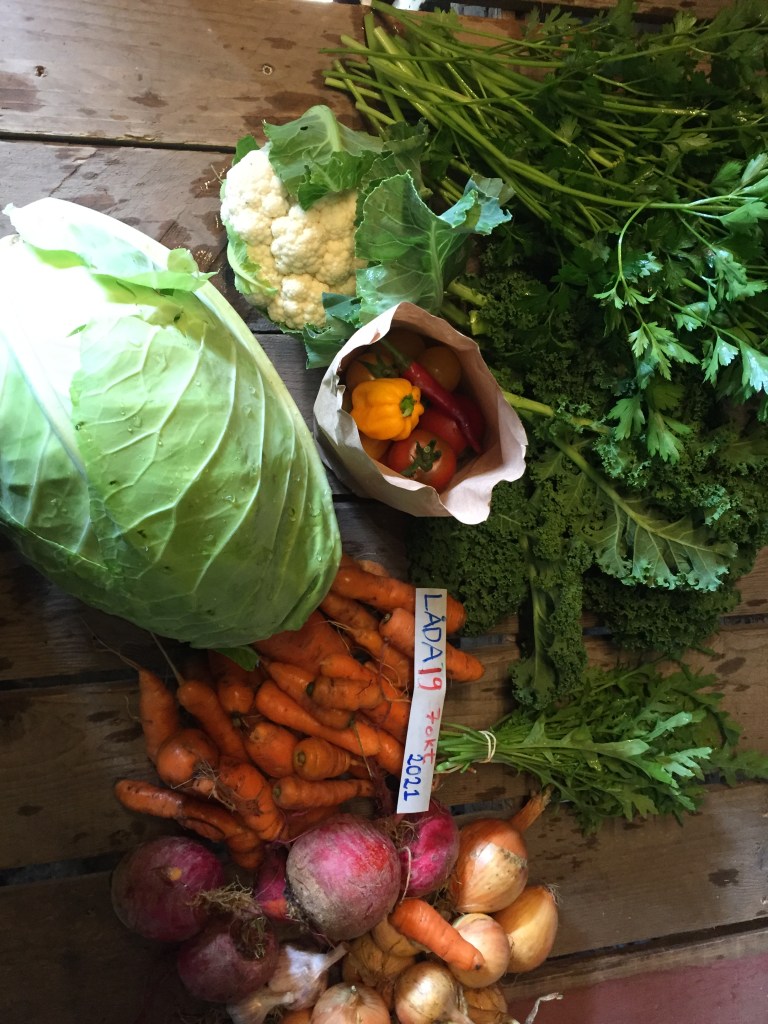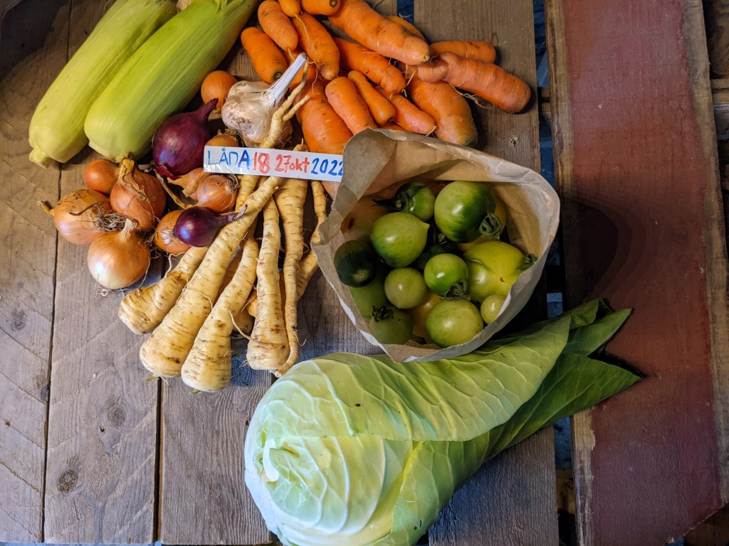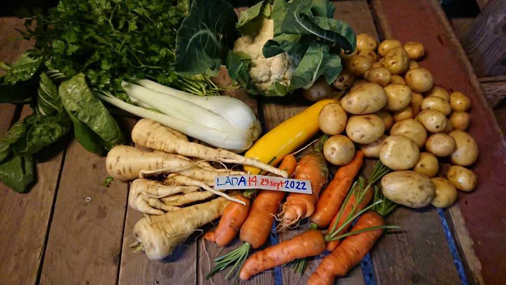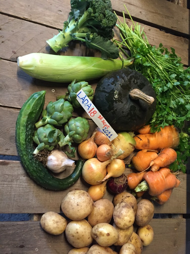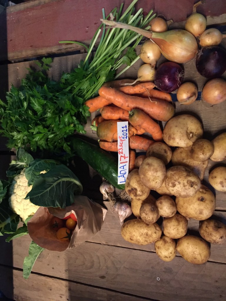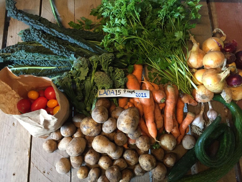 En andel av vår grönsaksskörd 2025 innebär runt 25 lådor med nyskördade och ekologiska grönsaker från gården. Grönsakerna levereras en gång i veckan från juni till november. Ni anmäler er till hela säsongen och men har möjlighet att skjuta upp tre lådor till senare och få dessa som ”dubbelleveranser” under leveranssäsongen.