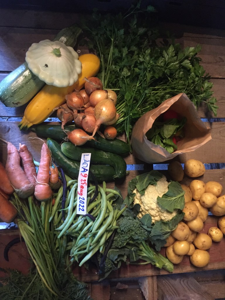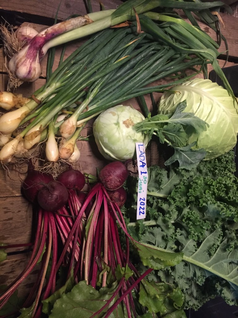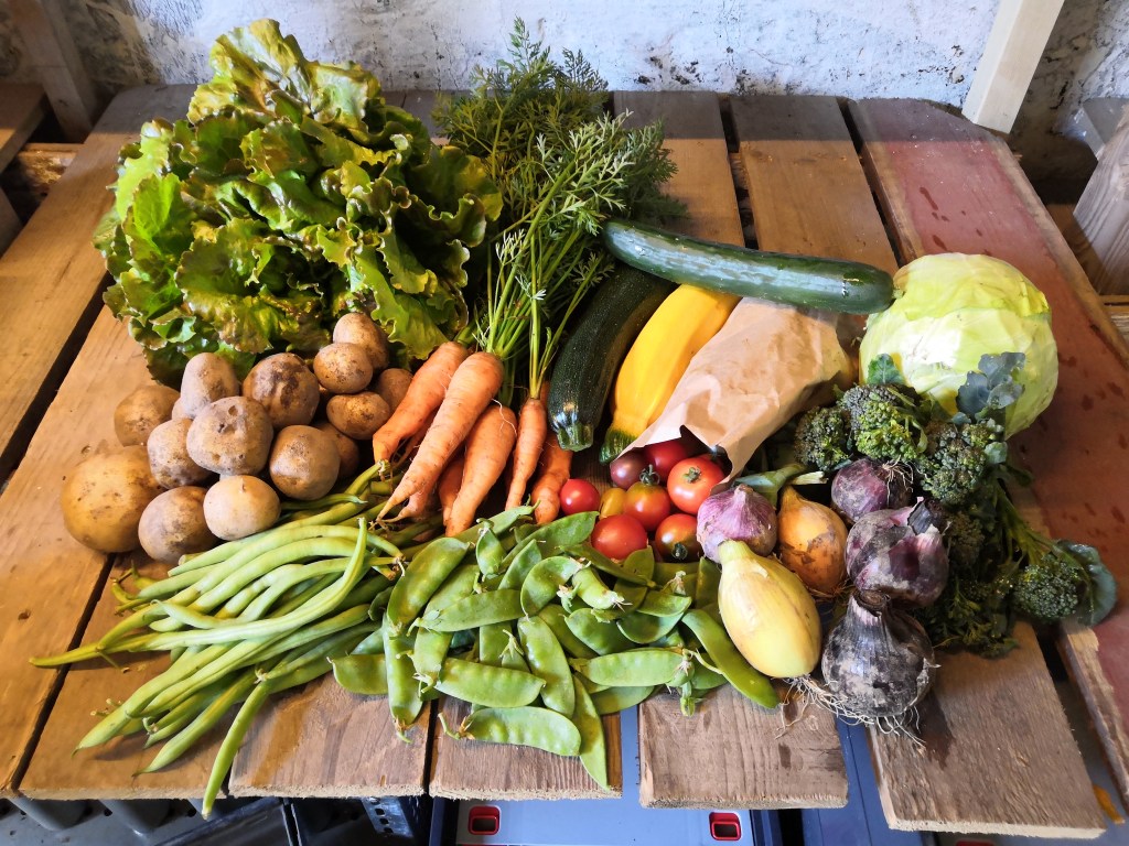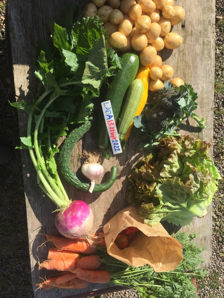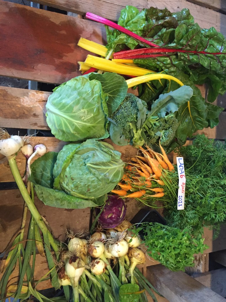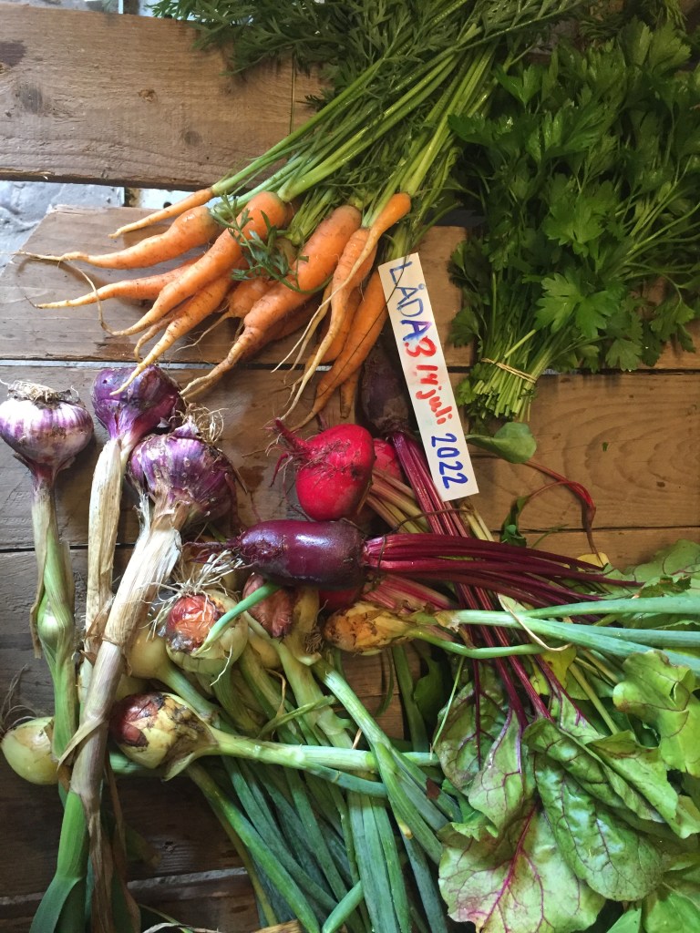 En andel av vår grönsaksskörd 2025 innebär runt 25 lådor med nyskördade och ekologiska grönsaker från gården. Grönsakerna levereras en gång i veckan från juni till november. Ni anmäler er till hela säsongen och men har möjlighet att skjuta upp tre lådor till senare och få dessa som ”dubbelleveranser” under leveranssäsongen.