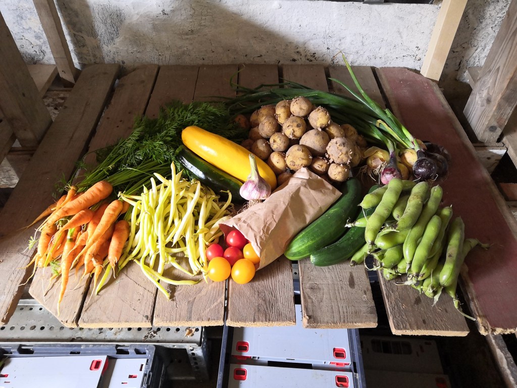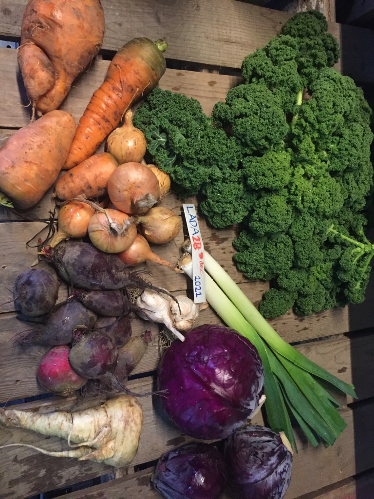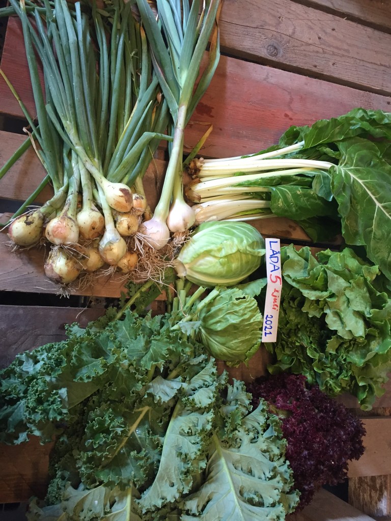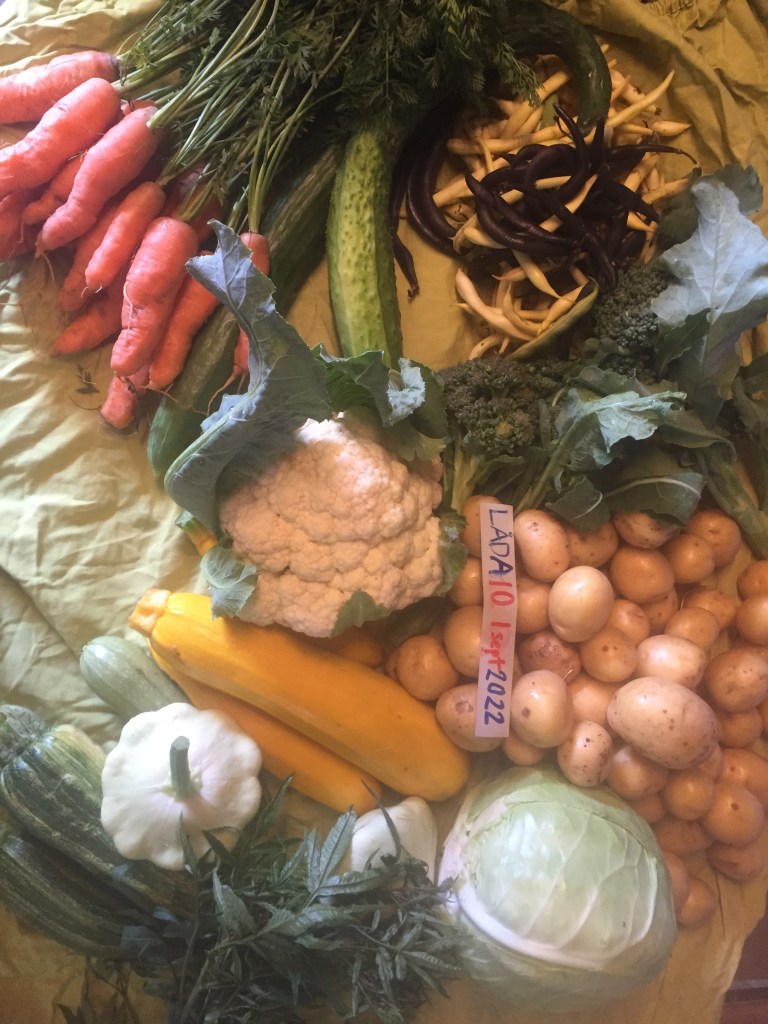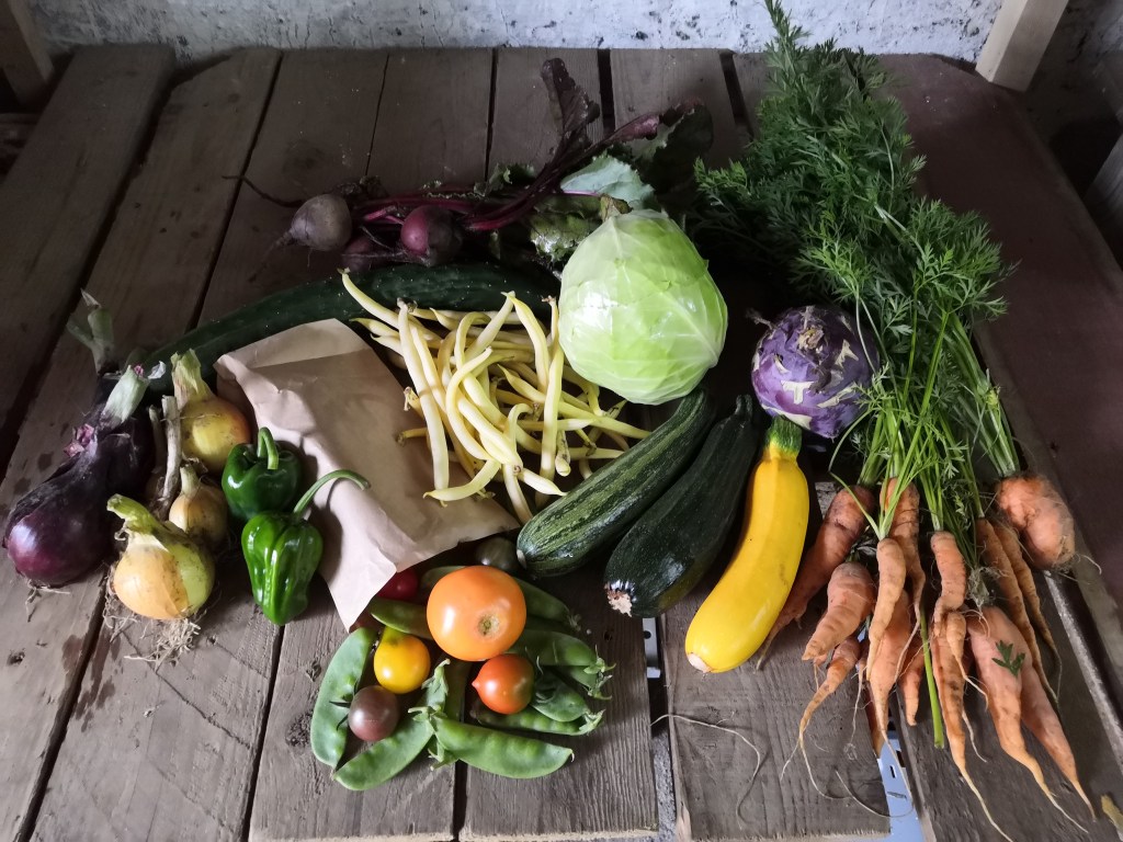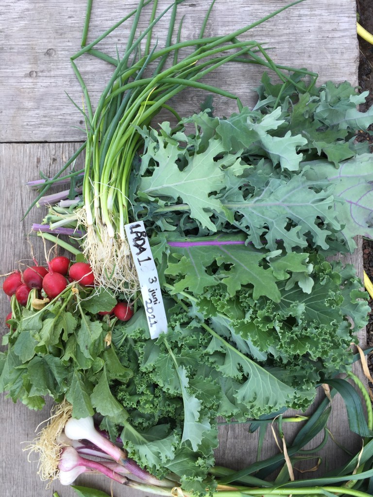 En andel av vår grönsaksskörd 2025 innebär runt 25 lådor med nyskördade och ekologiska grönsaker från gården. Grönsakerna levereras en gång i veckan från juni till november. Ni anmäler er till hela säsongen och men har möjlighet att skjuta upp tre lådor till senare och få dessa som ”dubbelleveranser” under leveranssäsongen.