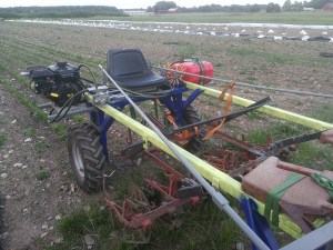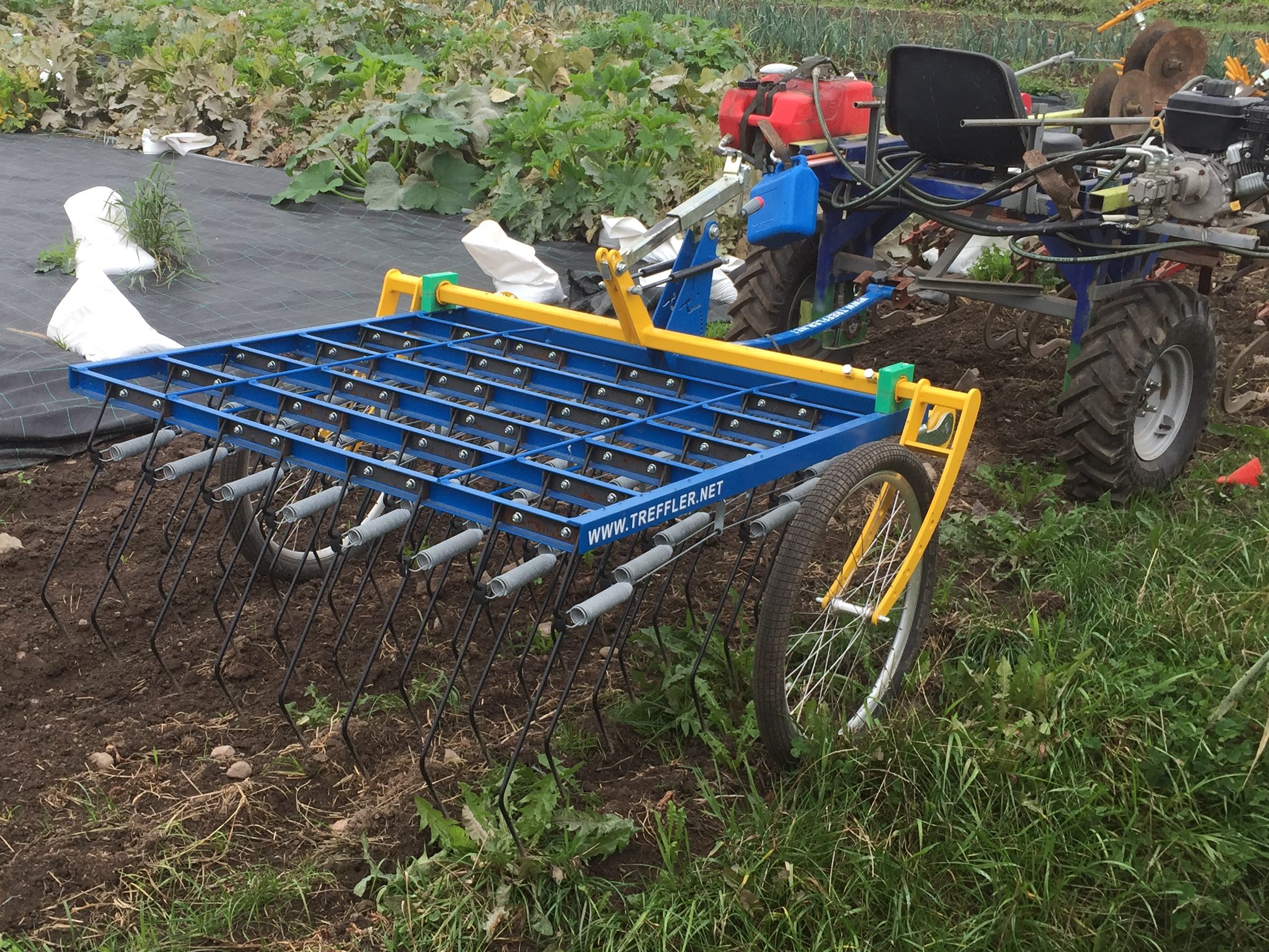 Allt skördas för hand förutom potatisen som vi tar upp med hjälp av en potatisupptagare. Ibland använder vi en rotfruktslossare på traktorn när vi ska ta upp mycket morötter. Vi tycker det är kul att fundera kring vilket redskap som är lagom stora för de moment som vi gör. Vi kommer ofta i något mellanläge där det inte är möjligt att använda bara handredskap och där maskiner till traktorn känns för stora. Det hade varit kul om vi klarade mer med handkraft men vi har kommit till ett läge där vi känner oss tvungna att gå några steg till mot maskin/traktor hållet för att få företaget att gå runt ekonomiskt och kroppsligt. Vi försöker så gott det går att försöka hitta sätt med mindre maskiner som radrensaren nedan istället för stora tunga traktorn.
